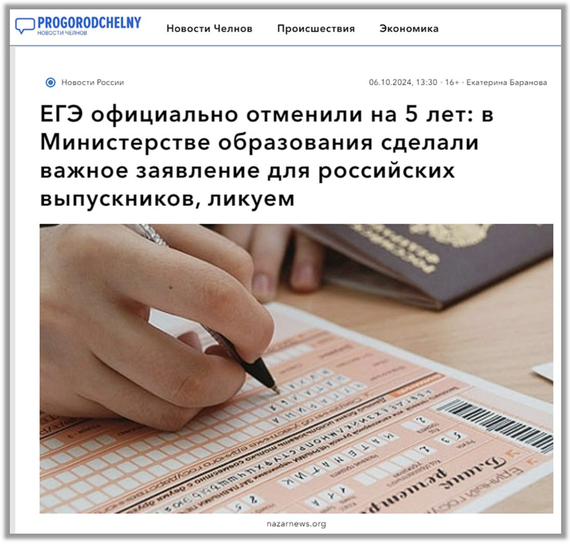 Вот все всегда кричат, что не нужно верить блоггерам, что нужно доверять только официальным источникам и все всегда перепроверять по несколько раз. Ну да, ну да. Откопал такую новость из официального источника, что все блоггеры разом посмеялись так, что животики лопнули. Посмотрите на этот заголовок и полюбуйтесь. Как я понимаю, данная газета, данное издание - это вестник Набережных Челнов. И причем очень некомпетентный вестник, потому что как можно варивать людям такой бред? Данное СМИ еще и официально зарегистрировано. Можете прочесть текст их статьи полностью по данной ссылке - https://progorodchelny.ru/russia/view/ege-oficialno-otmenili-na-5-let-v-ministerstve-obrazovania-sdelali-vaznoe-zaavlenie-dla-rossijskih-vypusknikov-likuem ЕГЭ официально отменили на 5 лет: в Министерстве образования сделали важное заявление для российских выпускников, ликуем В последние годы российских одиннадцатиклассников ожидают значительные изменения в системе сдачи выпускных экзаменов. Некоторым учащимс