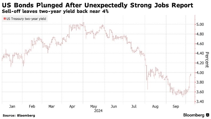 В понедельник, 7 октября, доходность десятилетних казначейских облигаций США выросла до 4%. Это произошло после того, как данные о рынке труда в США за прошлую неделю развеяли опасения о возможной рецессии.