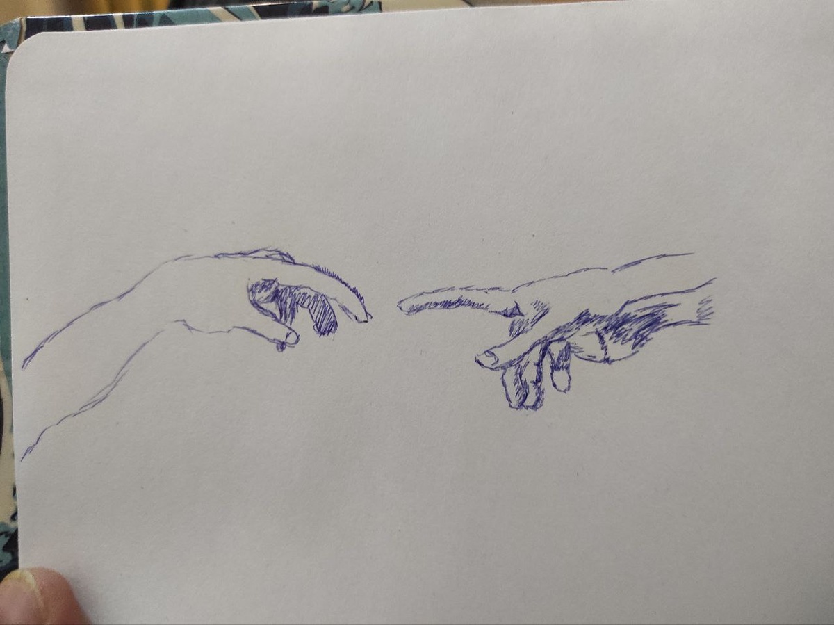 В общем-то, уважаемые читатели, мы предлагаем просто посмотреть. Вот его первый рисунок. Самый первый рисунок. А вот его последний рисунок. Но мы хотим сказать следующее. Это психолог, который пришел учиться на нашем курсе. И результатом его курса стало создание новой школы арт-терапии. Он не совсем умеет рисовать. Но он знает, что рисунок помогает нам отрефлексировать самих себя. Я не знаю, может вы слышали, может быть нет, но мы все призваны к творчеству. Кто-то к этому может быть скептически относится. Но мы все призваны к творчеству. Это творчество мы проявляем везде. И самое простое – это текст и рисунок. Это то, в чем мы можем все быть качественными. Мы очень рекомендуем обратиться к Тимуру. Почему? Это скромный психолог, который не выпячивает себя, а может методично работать. Почитайте его канал "Психолог рисует" с самого первого поста. Это еще и рефлексия. Замечательная рефлексия того, как он работает. Как он сомневается в себе. Как он боится рисовать. Как он идет