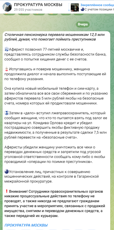 Теперь, когда на примерах кражи (ст. 158 УК РФ) и мошенничества (ст. 159 УК РФ) вкратце стало понятно, что и как происходит, нужно разобрать поподробнее алгоритм действий. Итак, в отношении гражданина совершено преступление, допустим мошенничество как здесь https://t.me/moscowproc/5577 Нужно пойти в полицию по месту жительства и в дежурной части территориального отдела полиции (не у участкового) написать заявление о преступлении. (Есть варианты подать заявление через официальный сайт или по телефону, но в случае такого мошенничества, лучше всё-таки в дежурной части отдела полиции. А вот в случае только что совершённой кражи или грабежа, лучше позвонить по телефону, чтобы сотрудники поскорее выехали на место совершения преступления и установили обстоятельства).