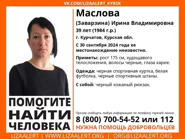 Поисковый отряд «Лиза Алерт Курск» сообщил об исчезновении 39-летней жительницы города Курчатова Курской области. И распространил ориентировку на ее поиск. По данным волонтеров, пропала Маслова (Заварзина) Ирина Владимировна. Ее местонахождение неизвестно с 30 сентября. Приметы: рост — 175 см, худощавого телосложения, волосы черные, глаза карие. Одежда: черная спортивная куртка, белая футболка, черные спортивные штаны. С собой: черный кожаный рюкзак. Сергей Яшин, по материалам https://vk.com/lizaalert_kyrsk Постоянный адрес новости на сайте «Друг для друга» ~ https://dddkursk.ru/lenta/2024/10/07/112584/. Новости Курска за ~ 7 октября ~ октябрь 2024 года.