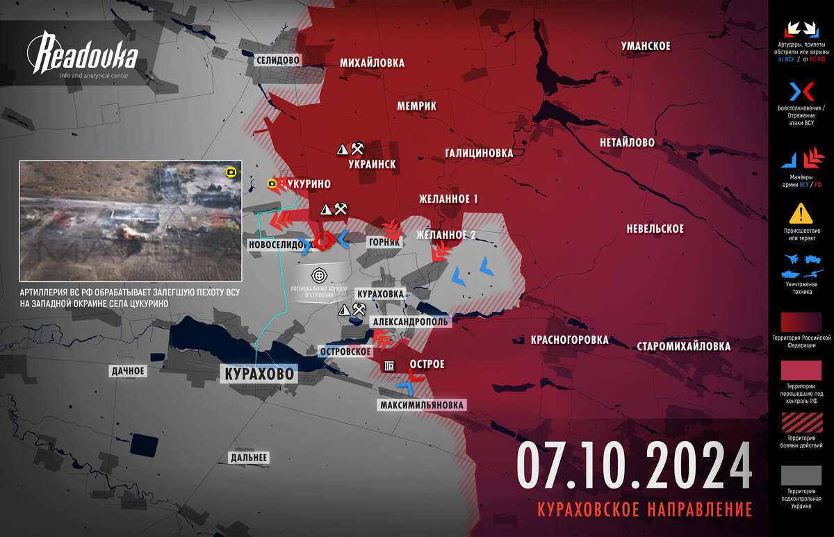 Редакция Readovka собрала важные события за 7 октября в разрезе СВО. Русская армия после освобождения села Желанное Второе создала ВСУ прямую угрозу окружения части сил на восточном берегу Волчьей. В связи с этим противник быстро отступает в Кураховку. Украинские подразделения также оставили село Цукурино, давление наших соединений на запад и на юг от населенного пункта усиливается. Командующий войсками РХБЗ ВС РФ Кириллов заявил об угрозе провокаций Киева с применением боевых отравляющих веществ. Восемь генералов из различных ведомств лишились своих должностей. Российские суды приговорили к разным срокам заключения граждан США, один из них бывший наемник ВСУ. Экс-заместителю министра обороны Тимуру Иванову предъявлено новое обвинение, ему инкриминируют растрату более чем ₽3 млрд. Readovka запустила свой патриотический мерч в честь дня рождения президента Владимира Путина..