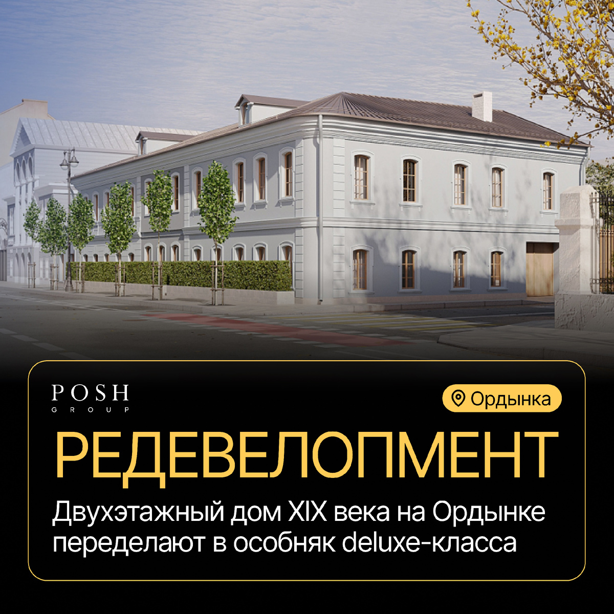 Из особняка в центре Москвы, известного как «Жилой дом, XIX век», планируют сделать ультрадорогое жилье. Здание расположено на углу Большого Ордынского переулка и улицы Большая Ордынка. Архитектурный проект подготовило бюро Arch(e)type: исторический облик дома планируют сохранить, при этом полностью изменят его «начинку». Здесь появится собственный приватный сад и открытая веранда. Особую ценность дому придает соседство с городской усадьбой Арсеньевых. Будущий особняк образует с ней стилистическое единство — здание выкрашено в тот же цвет. Хотите выбрать недвижимость в Москве вместе с POSH GROUP? Напишите нам или позвоните по телефону: +7 (495) 744 35 87.