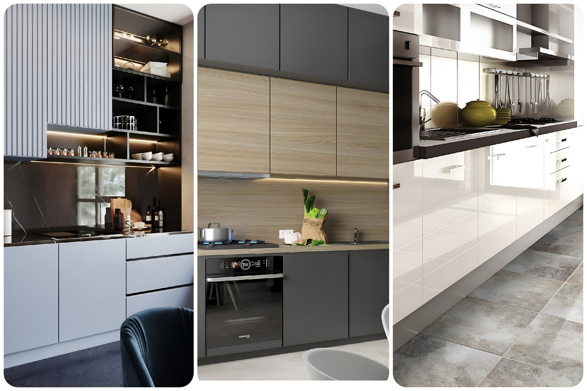 Например, глянцевые фасады отлично визуально расширяют пространство, что особенно полезно для небольших кухонь. Однако они могут казаться холодными. Если ваша кухня хорошо освещена, глянец может создавать нежелательные блики. В таких случаях матовые поверхности будут лучшим выбором, так как они придают уют. Комбинирование глянцевых и матовых фасадов может стать интересным решением. Это поможет создать контраст и добавить оригинальности. Например, у вас может быть верх кухонного гарнитура