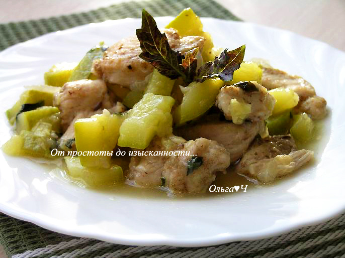 1 веточка базилика Приготовление: Куриное филе нарежьте небольшими кусочками, обваляйте в смеси из муки, тмина, кориандра. Обжарьте на растительном масле, выложите на тарелку, держите в тепле. На том же масле обжарьте лук и чеснок. Добавьте кабачок, нарезанный кубиками, продолжая обжаривать. Затем верните куриное филе в сковороду, влейте бульон, посолите, поперчите, готовьте 20-25 минут. За 5 минут до окончания приготовления добавьте нарезанный базилик. Разложите блюдо по тарелкам и подавайте. Приятного аппетита! Вам также могут понравиться: