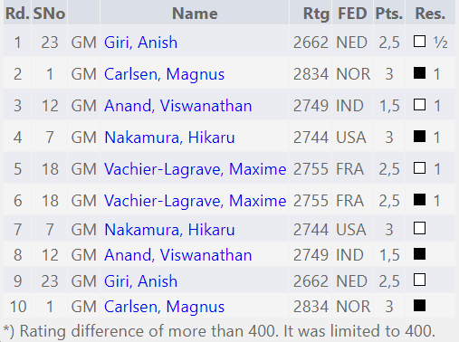 Сейчас в Лондоне идёт очень интересный турнир Global Chess League (глобальная шахматная лига). В турнире 6 команд, играют в 2 круга. Составы представительные - лучшие шахматисты и шахматистки мира. Составы можно посмотреть здесь: Партии вот здесь: Контроль времени редкий - 20 минут на всю партию (без добавления!), что способствует нелогичному результату партии, потому что проигрывающий игрок может срубить флаг соперника. Главное, быстро работать руками. Блистает Алиреза Фирузджа - 5.5 из 6, его карточка: Если брать шахматную часть партий, то всё не так радужно. Конечная позиция, результат 0:1. Почему? Потому что у Карлсена упал флаг (закончилось время). Вот чтобы таких парадоксальных результатов не было и придумали добавлять время за каждый ход, чтобы у игрока была возможность реализовать технический перевес. Иначе шахматы превращаются в игру "кто быстрее двигает руками", при этом фигуры летят во все стороны и шахматные часы часто ломаются из-за сильных ударов по кнопкам. Алиреза