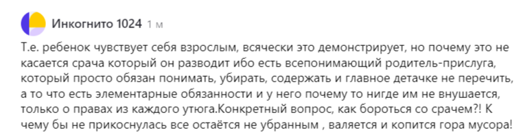 Возвращаясь к комментарию, а именно к словам «есть всепонимающий родитель-прислуга, который обязан понимать, убирать, содержать и не перечить деточке».