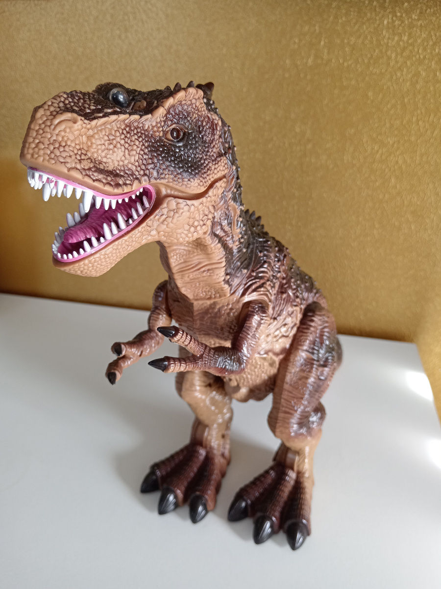 Приветствую Вас в своём блоге! Сегодня хочу поделиться с Вами нашими впечатлениями от игры с тиранозавром на пульте управления от Attivio. Ребёнок попросил в подарок на день рождения ходящего и рычащего тирекса, в процессе долгих поисков и выбора я остановилась на этом гиганте. Динозавр продаётся в привлекательной подарочной коробке. В комплекте: динозавр, пульт управления, баночка для заливки воды. Тиранозавр умеет ходить (ходьба комфортная не быстрая, не медленная), движет головой и лапами, издаёт звуки ходьбы, рычит, у него светятся глаза и рот, идёт пар из пасти, управляется динозавр с помощью пульта в виде древнего камня с двумя кнопками (ходьба и звуки). Для работы требуется 7 батареек типа АА (нет в комплекте) Тиранозавр оказался неожиданно большого размера, у него довольно реалистичный дизайн, мягкая резиновая голова придаёт ещё большей реалистичности. Ребёнок был в восторге, игрался просто нон-стоп, динозавр у нас 2 дня вообще не останавливался. Я переживала, что 10-ти мес