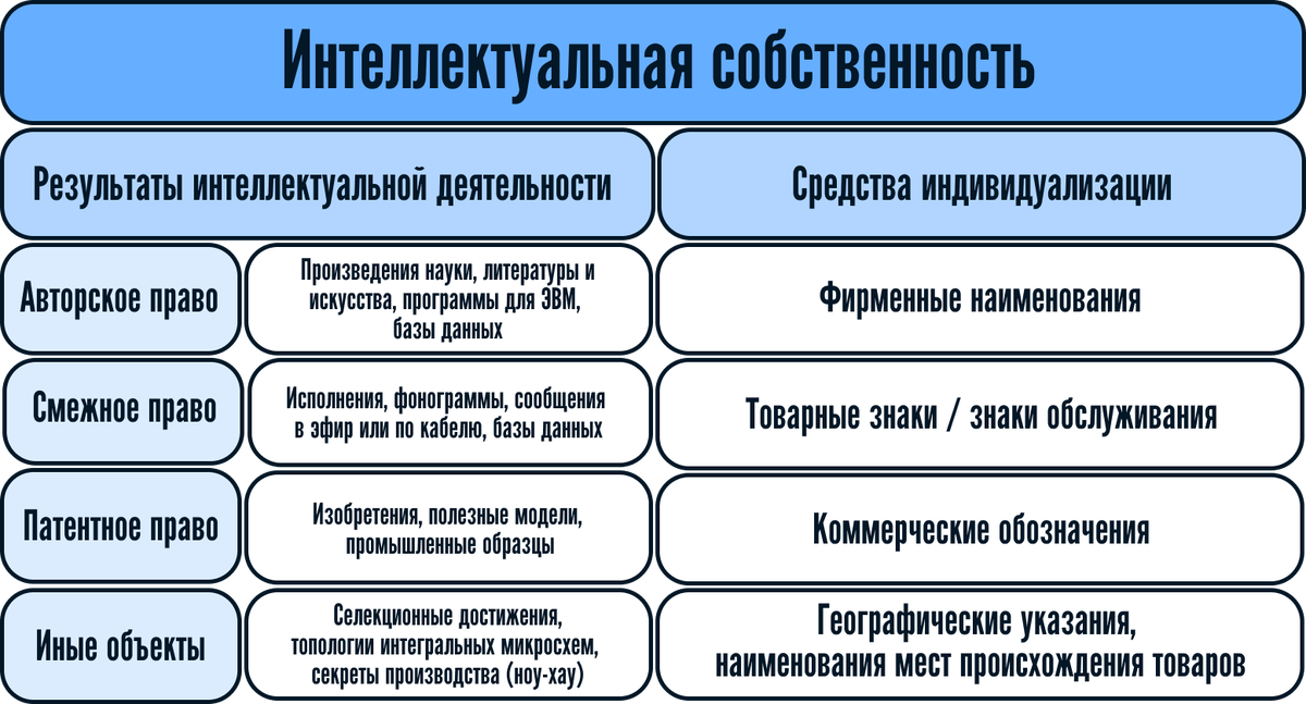 Для начала вспомним, что интеллектуальная собственность делится на две большие группы – результаты интеллектуальной деятельности и средства индивидуализации. Что входит в каждую из них, отражено на схеме: