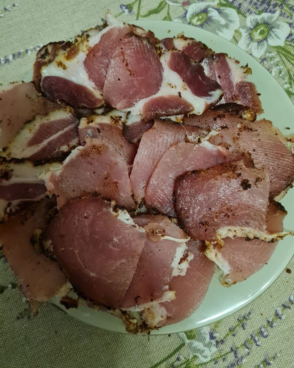 Беру свинину на рынке (шея, корейка, грудинка, в принципе любая часть вполне подойдет), убираю в морозилку, достаю после полной заморозки, размораживаю и натираю солью (я использую смесь нитритной соли и обычной, смешанной один к одному, из расчета 1 столовая ложка на 1 кг мяса), убираю в холодное место минимум на 4 суток, периодически сливая выделяемую мясом жидкость. Через положенное время мясо обмываю в проточной воде, чтобы смыть все остатки соли, насухо вытираю бумажным полотенцем. Делаю смесь для покрытия нашего мяса: примерно по чайной ложке перца молотого, аджики сухой, хмели сунели, пажитника, сумаха, паприки (специи и их количество можно регулировать по своим вкусовым ощущениям, я просто люблю все пряное), добавляю в смесь немного воды и довожу до состояния жирной сметаны. Далее обильно смазываю мясо полученной смесью, заворачиваю в пергамент и в зависимости от погоды убираю либо на нижнюю полку холодильника, либо вывешиваю на балкон примерно на месяц - полтора. Предварительн