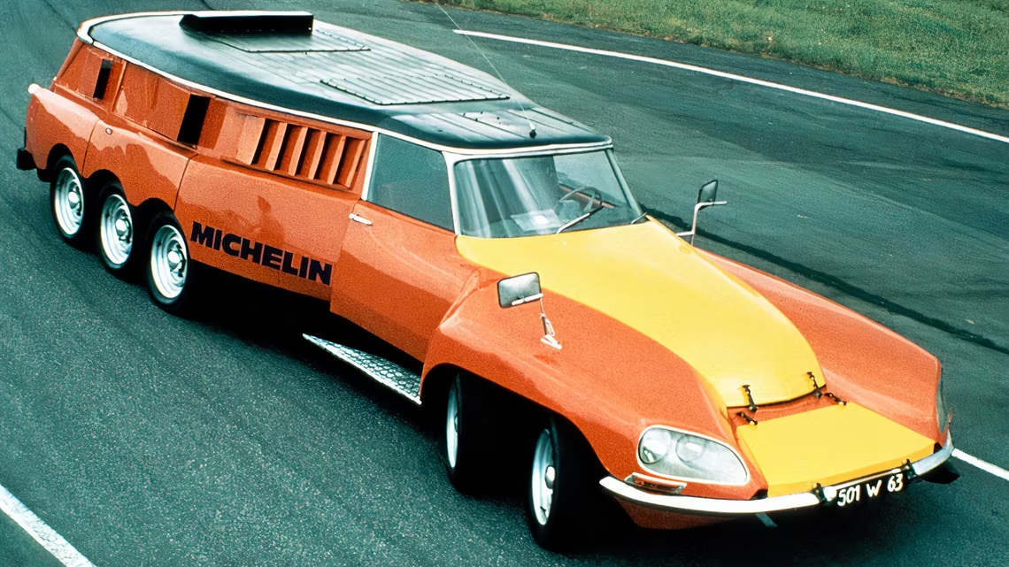 Что общего у всех автомобилей, грузовиков и внедорожников? Недостаточно колёс. По крайней мере, так, похоже, думала компания Michelin когда придумала этот нелепый десяти-колёсный универсал Michelin PLR 1972 года. У «Сороконожки», было не только несколько дополнительных колёс, но и два двигателя, а длина составляла невероятные 7,3 метра.