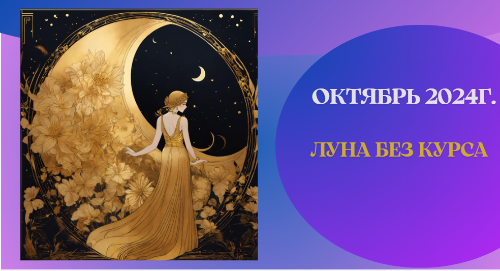 Друзья, публикую даты Луны без курса (Холостой Луны) на Октябрь 2024 г. для эффективного планирования. Информация опубликована в следующей последовательности: дата и время начала периода Луны без курса— дата и время окончания периода Холостой Луны, вхождение Луны в новый знак. Время указано московское. ЛУНА БЕЗ КУРСА, ОКТЯБРЬ 2024. 02.10.2024 00:39 — 02.10.2024 01:19,Весы 04.10.2024 13:40 — 04.10.2024, 14:22, Скорпион 07.10.2024 01:52— 07.10.2024, 02:34, Стрелец 09.10.2024 08:54— 09.10.2024, 12:38, Козерог 11.10.2024 18:53 — 11.10.2024, 19:31, Водолей 13.10.2024 17:11 — 13.10.2024, 22:55, Рыбы 15.10.2024 23:00— 15.10.2024, 23:34, Овен 17.10.2024 22:27 — 17.10.2024, 23:00, Телец 19.10.2024 22:33 — 19.10.2024, 23:07, Близнецы 21.10.2024 23:59 — 22.10.2024, 01:49, Рак 24.10.2024 07:47 — 24.10.2024, 08:24, Лев 26.10.2024 11:04 — 26.10.2024, 18:47,Дева 29.10.2024 06:54 — 29.10.2024, 07:29, Весы 31.10.2024 19:57 — 31.10.2024, 20:29,Скорпион Бла