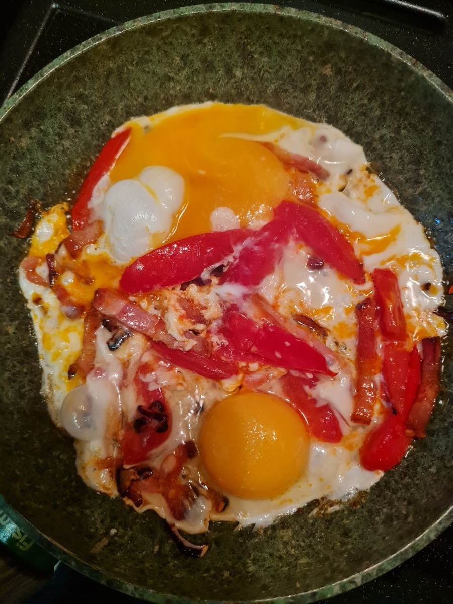Яичница с копченым беконом и помидорами на завтрак - лучшее начало трудового дня