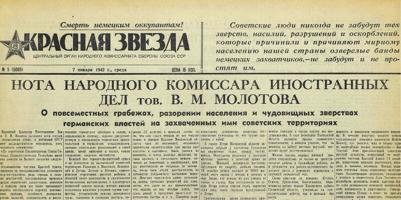 6 января 1942-го Нарком иностранных дел СССР В.М. Молотов направил всем послам и посланникам стран, с которыми СССР имел на тот момент дипломатические отношения, ноту «О повсеместных грабежах, разорении населения и чудовищных зверствах германских властей на захваченных ими советских территориях». На следующий день текст ноты был опубликован газетой «Правда» и других советских газетах.