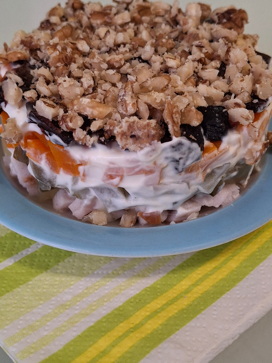 Состав: Приготовление: Салат собирается слоями. Можно делать порционный (при помощи кольца) или в прозрачный салатник. Я делала одну порцию в кольце, а остальную в контейнер, т.к. на каждый день а не для праздничного стола. Первый слой: курицу режем мелким кубиком, выкладываем на дно, утрамбовываем вилкой (или прессом от формы-кольца). Второй слой: огурцы солёные, режем мелко кубиком и выкладываем на курицу, утрамбовываем. Делаем «сеточку» из майонеза. Для этого делаем 1-2 маленьких отверстия в крышке. Третий слой: отваренную и очищенную морковь режем мелким кубиком. Делаем «сеточку» из майонеза. Четвёртый слой: чернослив, если твёрдый, то распариваем в горячей воде и режем мелким кубиком. Делаем «сеточку» из майонеза. Пятый слой: ядра грецких орехов измельчаем и посыпаем сверху. Орехи можно нарезать, а можно сложить в пакет и раздавить и раскатать скалкой. Так быстрее. Готово. Снимаем кольцо. Красота. Приятного аппетита!!