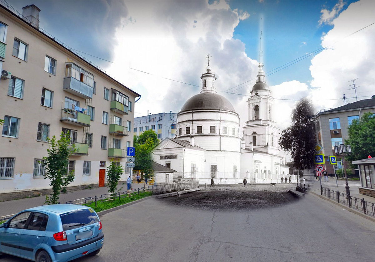 Если совместить снимок Благовещенской церкви 1910 года и современность, то сейчас бы перед нами был вот такой вид на перекрёсток современных улиц Благовещенская и Батюшкова, где церковь и стояла. Как место выглядело в 1910 году смотрим на втором снимке, а современный вид без церкви здесь для сравнения.