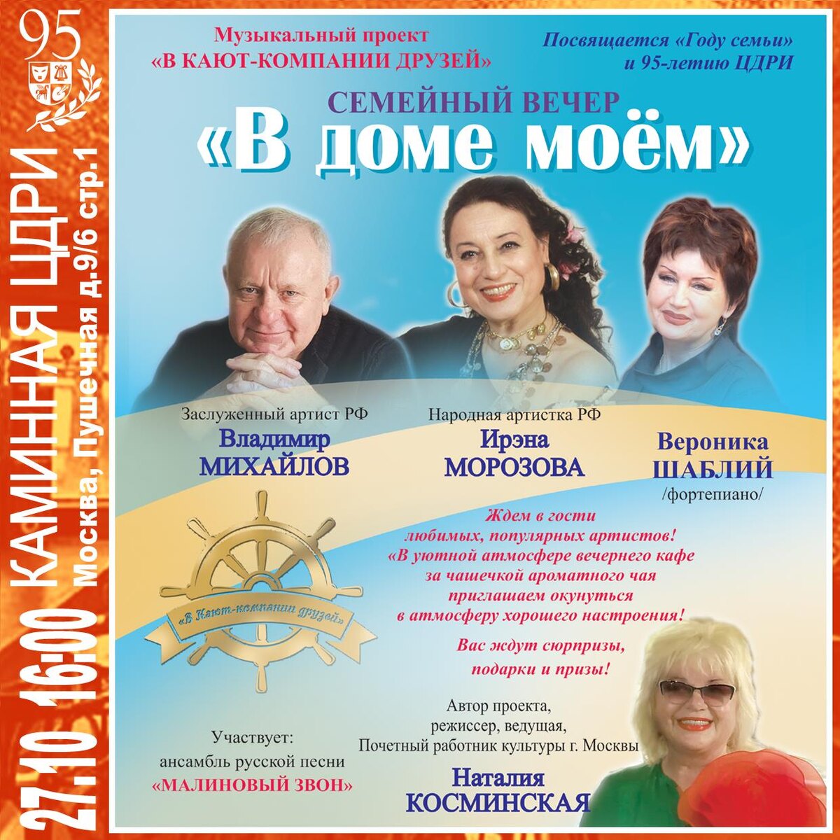 Авторский проект «В кают-компании друзей» По уже сложившийся традиции, приглашаем всех провести этот осенний вечер в «Кают-компании друзей» нашего любимого ЦДРИ. 2024 год объявлен «Годом семьи». Поэтому, в программе прозвучат песни и стихи о любви, о родном доме. На сцену будут приглашены зрители, желающие рассказать интересные случаи из жизни своей семьи. Участников и Победителя ждут призы. В концертной программе выступят: народная артистка РФ — Ирэна МОРОЗОВА заслуженный артист РФ — Владимир МИХАЙЛОВ — композитор, экс-солист ВИА «Лейся, песня», исполнитель песен из репертуара Валерия Ободзинского партия фортепиано — Вероника ШАБЛИЙ ансамбль русской песни «МАЛИНОВЫЙ ЗВОН» Автор проекта, режиссер, ведущая, Почетный работник культуры г. Москвы — Наталия КОСМИНСКАЯ ЦДРИ: г. Москва, ул. Пушечная 9/6 стр.1