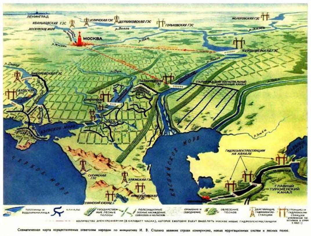 Схематична карта на големите строежи на комунизма, новите напоителни системи и горските пояси, осъществени от съветския народ по инициатива на Сталин.