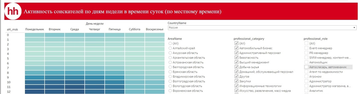 За весь период своей работы в подборе персонала о каких только версиях для эффективного размещения вакансий я не слышала. Кто-то старался размещать исключительно до обеда, потому что наблюдал пик активности кандидатов по просмотрам вакансии. Кто-то в обеденное время, т.к. считал, что кандидаты просматривают вакансии в перерыве от работы. В последнее время я придерживалась мнения, что перед тем как уйти на выходные (сб, вс), неплохо было бы успеть разместить новые вакансии или обновить текущие, чтобы за выходные собрать отклики. Но сейчас я стала сомневаться... А всё потому, что недавно открыла для себя новый источник, которым предлагает пользоваться hh, где можно посмотреть активность соискателей по дням недели и времени суток. https://public.tableau.com/app/profile/alkadarskiy.selim/viz/Book1_15809098075850/232020