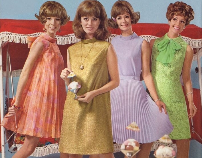 Если говорить о моде того времени, то были популярны очень короткие юбки и платья, многие носили костюмы. Кстати, некоторые наряды передавались по наследству.