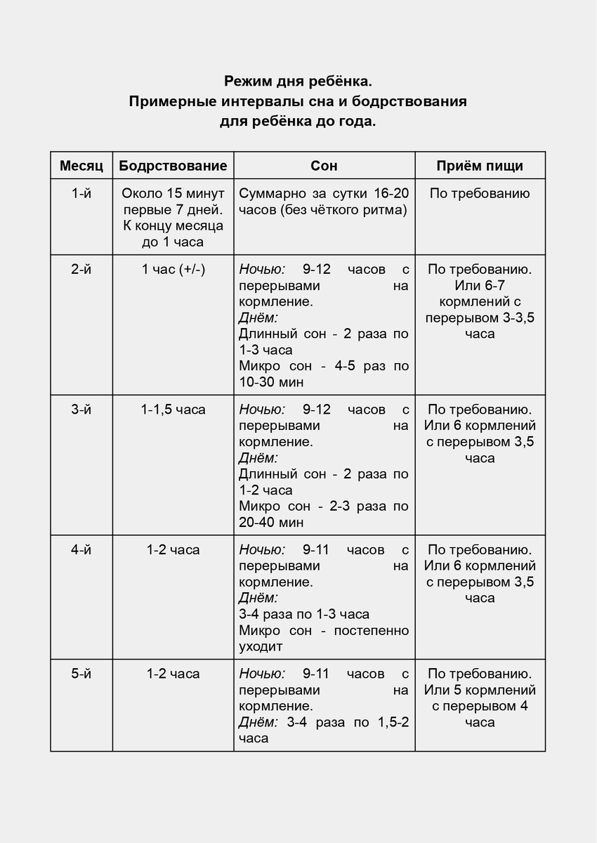 В первые две недели жизни (а лучше до 1 месяца) ребёнку необходим режим "по требованию". Кормление по требованию. Младенец приспосабливается к жизни вне маминого животика, ему необходимо научиться есть. Маме, в свою очередь, нужно научиться кормить. Для лёгкой адаптации новорождённого нужно прикладывать к груди очень часто. Самый простой и эффективный метод - предлагать грудь по первой просьбе (плачу, беспокойству). Так будет налажен контакт с мамой, нервная система в порядке, и голодным малыш не останется. Сон по требованию. Сон в первые недели жизни имеет колоссальное значение. Малыш почти всё время спит, и это норма. Тут нет каких-то рамок: пусть спит столько, сколько нужно. Есть ошибочное мнение, что если младенец спит больше 4 часов, его нужно разбудить и покормить. Так как ребёнку нельзя долго оставаться без еды. Действительно, регулярно голодать ребёнку нельзя. Но будить, если малыш 1-2 раза в день разоспался, точно не стоит. К счастью, ещё ни один ребёнок не умер во сне от голо