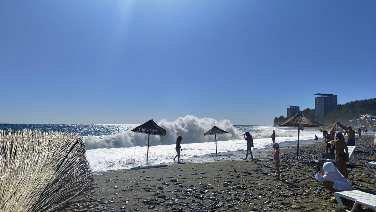 29 сентября. Место впадения горной реки в море, пригодное для купания 8-ой день отдыха. После завтрака пошли на пляж. Но сильные волны дали понять, что искупаться не получится. Народу никого. Пара загорающих и всё. Но мы не сдаёмся, жарко ведь и освежиться хочется. Подумали, что на пляже курорта волн нет, там ведь бухта и почти всегда штиль. Сели на машину и поехали в центр Пицунды. Но кто знал, что тут шторм окажется ещё сильнее и волны больше, чем на диком пляже в два, нет даже в три раза! Вода выплескивалась на бо́льшую часть пляжа и окутывала ножки зонтиков. Некоторые поломались. Отдыхающие с любопытством смотрели на происходящее. Стоял такой грохот от волн, что казалось, что это гром гремит прямо над нами. Кораблики ушли подальше от причала, иначе они разбились бы об него в два счета! Волной накрывало почти треть пирса! Жаль, но фото вообще не передают реальный размер и силу волн. По ощущениям высота волны иногда достигала 3 метров! Короче понаблюдать было интересно, но мы реши