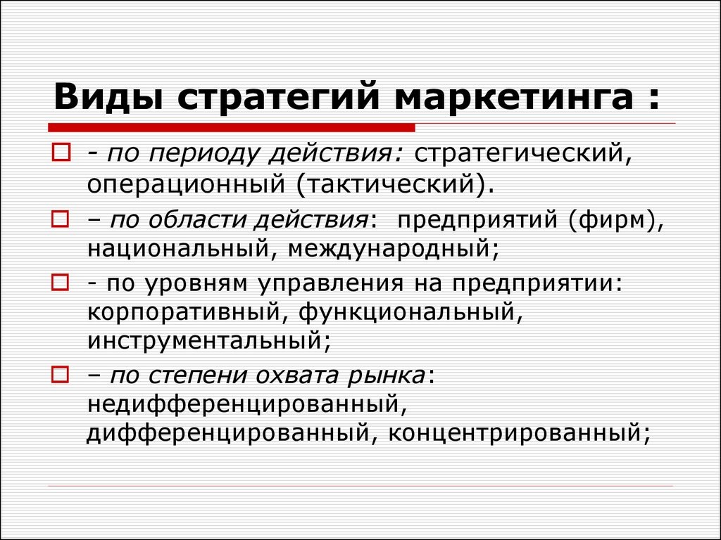 Какими бывают стратегии маркетинга Маркетинговая стратегия — план действий по продвижению продукта и увеличению прибыли компании. Стратегия всегда уникальна: каждая компания разрабатывает свою в зависимости от целей, ассортимента, особенностей ниши, целевой аудитории. Компания может работать и без стратегии, но тогда маркетинг хаотичен и малоэффективен. Исследователи выделяют разные классификации стратегий маркетинга. Например, есть глобальные, базовые и конкурентные. В каждой группе выделяют подгруппы стратегий — разберёмся в этом подробнее. Глобальные стратегии представлены пятью видами маркетинговых стратегий: интернационализация — выход на новые зарубежные рынки и укрепление позиций на них; сегментирование — производство разных продуктов под все сегменты аудитории; глобализация — выпуск продуктов по единым требованиям рынка; диверсификация — создание максимально широкого ассортимента и освоение новых направлений; кооперация — сотрудничество с другими компаниями. Базов