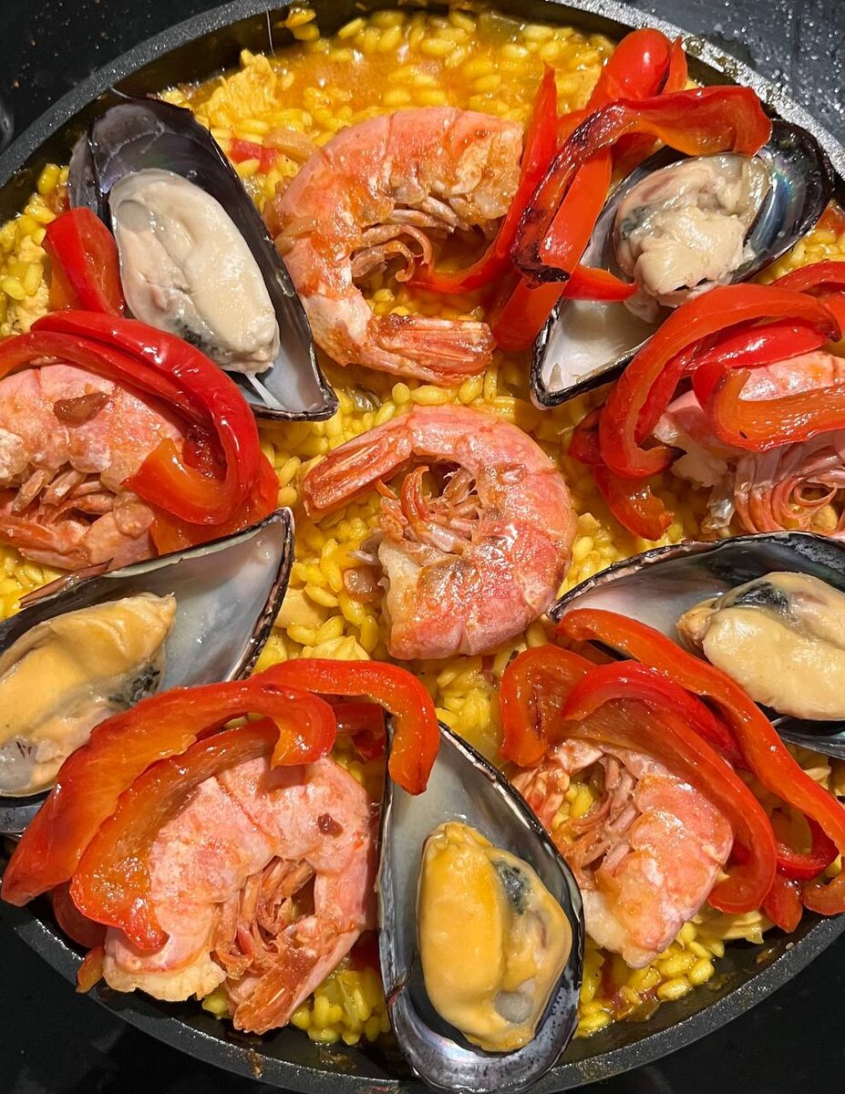 Рецепт паэльи микста 🍚🐟🍗 Ингредиенты: - Рис для паэльи (арборио) - 300 г - Куриная грудка - 250 г - Морепродукты (креветки, кальмары, мидии, ракушки вонголе) - 300 г - Оливковое масло - 3 ст. ложки Овощи: - Помидоры - 2-3 шт. - Красный перец - 1 шт. - Зеленый перец - 1 шт. - Чеснок - 3 зубчика - Лук - 1 шт. - Стручковая фасоль или горох (по желанию) - 100 г - Белое вино - 150 мл Специи: - Приправа для паэльи (или шафран и копченая паприка) - Соль и перец - по вкусу - Лимон - 1 шт. (для подачи) Приготовление: 1. Приготовление бульона: 🥘 - Отварите куриную грудку в подсоленной воде до готовности. Сохраните бульон. - Очистите морепродукты и добавьте их очистки в бульон для более насыщенного вкуса. 2. Пассировка овощей: 🥕🧅 - На сковороде разогрейте оливковое масло. Обжарьте мелко нарезанный лук и чеснок до прозрачности. - Добавьте нарезанные кубиками красный и зеленый перец, а также стручковую фасоль или горох. Пассируйте еще 3-5 минут. - Затем добавьте очищенные помидоры, натерты