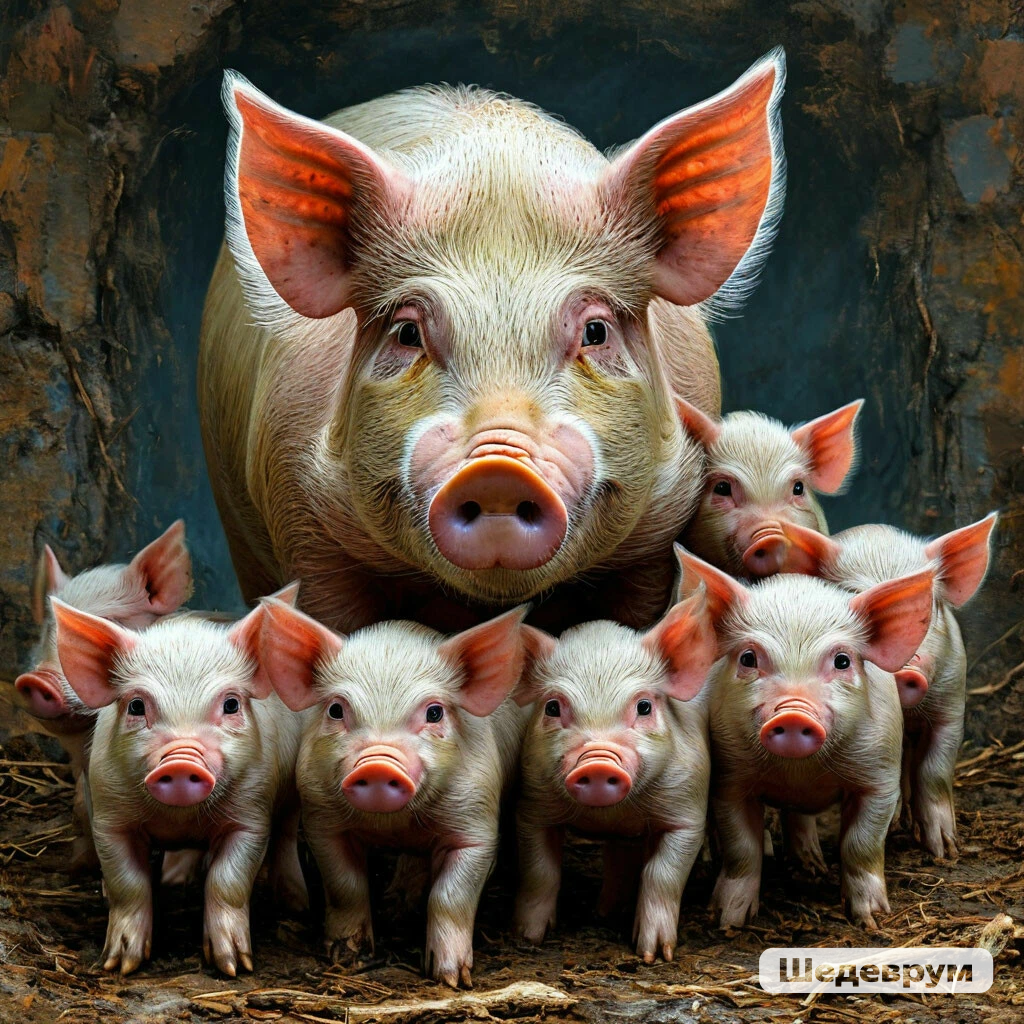 Чебурашка вскочил и бросился во двор. Там он увидел Машу-свинью, которая бегала по огороду, визжа и махая копытцами. Рядом с ней, весело виляя хвостиками, резвились её пять поросят.