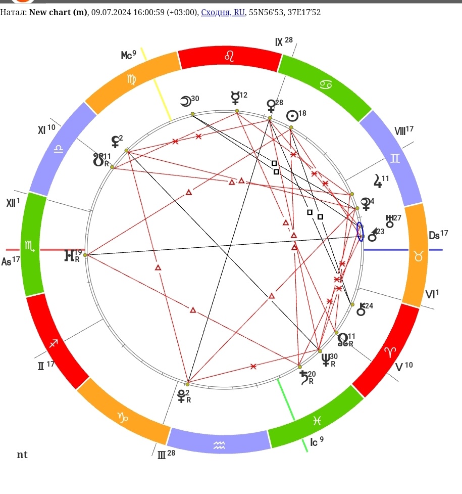 Вся карта достаточно гармоничная и негативных аспектов как таковых нет, но это и стимула и энергии так, все будет идти планомерно! Но отсутствие оппозиций и квадратов в карте говорит о том, что автор не будет бороться за идею и в этом будет основная сложность, так как и препятствий как таковых нет, но и рост не особо стремительный, от чего энергии и запала будет не достаточно.