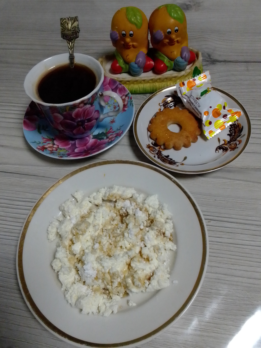 Пусть сегодня с самого утра все будет лучше, чем вчера. Доброе, доброе утро! С вами Надежда, и я приглашаю вас на мою кухню, где покажу вам наше меню на день. Сегодня будет теплый день, еще только 5 утра, а на термометре + 8 градусов. И это радует. Выглянула в окно, а асфальт сырой, ночью прошел дождь. Это очень хорошо, так как за всю осень не было ни капли дождя, хотя ( я вчера вечером смотрела прогноз погоды на 8 октября) дождя не обещали. На этой неделе ночные температуры опустятся даже до - 10. Пора завтракать: творог полила сиропом от варенья из грецкого ореха и присыпала сахарной пудрой, конечно это не так вкусно, как со сметаной , но есть можно, а также заварила черный растворимый кофе без сахара, к кофе была шоколадная конфета Уральский рыжик, нашей кондитерской фабрики г Екатеринбурга., с морковью, цукатами и орехами и печенье коржик. На улице свежо, дождь прибил всю пыль, природа словно умылась, и такая тишина, даже не слышно переклички петухов. Как быстро летит время, не
