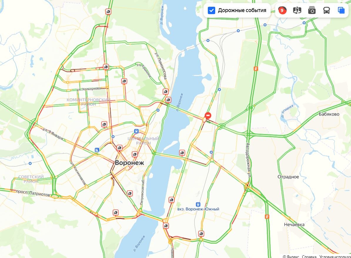 В Воронеже на дорогах полнейший аврал. 9-балльные пробки заставляют местных жителей задержаться с работы домой. Вероятно, коллапс спровоцировал дождь, идущий перманентно в течение всего дня. По данным сервиса «Яндекс. Карты», самая сложная обстановка сложилась в центре города. Усугубляет ситуацию на дорогах наличие сразу 14 ДТП, из которых десять случились на правом берегу и четыре – на левом. Одна из аварий произошла на привокзальной площади Черняховского. Там выстроились в «паровоз» сразу три машины. Читатели «Блокнота» поделились кадрами с места ДТП. Вокруг них образовалась пробка. В красный, а местами даже бордовый цвет, «окрасились» улицы Плехановская, Кольцовская, Кирова, Фридриха Энгельса, 9 Января, Бурденко. Огромные заторы образовались на проспекте Революции, Московском проспекте, 20-летия Октября и других улицах. На левом берегу скованными оказались Димитрова, Ленинский проспект, Остужева, Брусилова, проезд Разумова. Напомним, ранее стало известно о том, что в борьбу с вороне