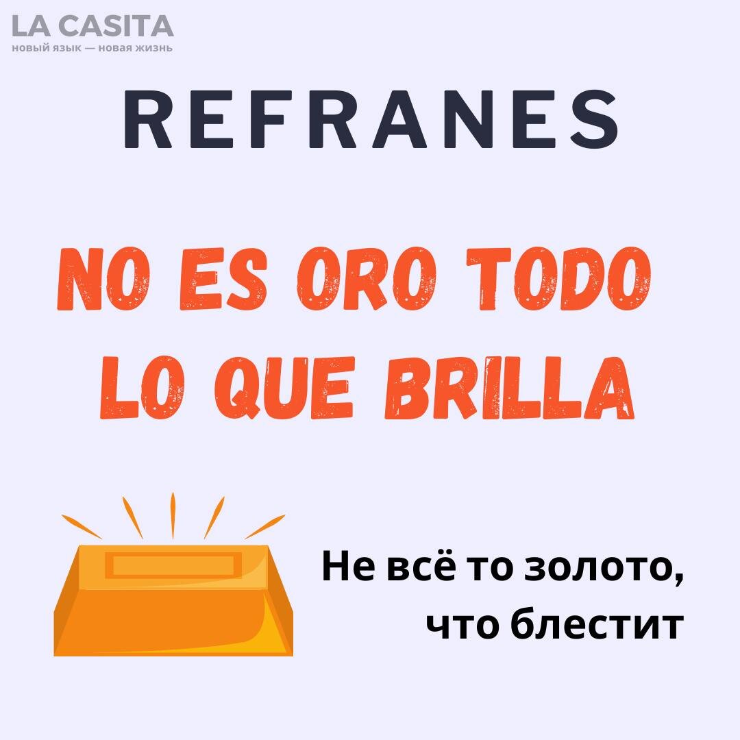 Chiquisss! Вы так здорово отреагировали на пословицы! ¡Gracias mil! 😍 Мы видели все ваши предложения и обязательно всё разберём! 💡 Сегодня пословица, которая имеет практически дословный перевод. На карточке вы видите самую употребимую версию, но она не единственная! Также говорят: "No todo lo que brilla es oro." Тоже часто встречающаяся форма, которая передаёт тот же смысл, просто меняем порядок слов: «Не всё, что блестит, — золото» 🥇 "No es oro todo lo que reluce." Relucir - сиять. Встречается реже, но всё ещё существует. 💝 А ещё классый бонус - Ману Чао в своей супер-известной песне Me gustas tú очень поэтично обыграл эту поговорку. Мы делали к ней субтитры тут, а сама фраза в самом конце. Кто ещё не учился с нами и сможет первым найти и рассказать в комментариях, в чём игра слов, получит подарок +1000р на обучение 🤗😁