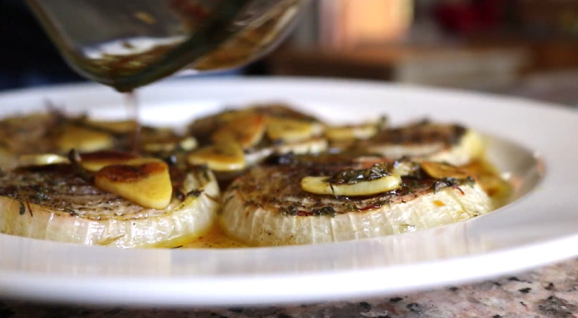 Приготовленное блюдо может выступать в качестве самостоятельной закуски, выполнять роль гарнира к мясу или курице, а также быть одним из ингредиентов в салате или бутерброде. Запеченные луковые колечки приехали к нам из Испании. Поэтому не удивляйтесь набору специй и пряных трав. 1. Нарежьте лук кольцами толщиной 6-7 мм. Выложите кусочки в один слой в форму для запекания. 2. Добавьте в 1 стакан вина 2 ст. л. оливкового масла, 1 ч. л. лимонного сока, 2 тонко нарезанных зубчика чеснока, 1/2 ч. л. сушеного тимьяна, соль и перец. Перемешайте. 3. Аккуратно влейте винную смесь на лук. Убедитесь, что ломтики чеснока плавают в винном соусе, а не лежат на колечках. Посолите, поперчите лук. Добавьте розмарин, он тоже должен плавать в вине. 4. Поставьте форму в предварительно разогретую до 210 градусов духовку. Готовьте 45 минут. При подаче полейте луковые колечки сверху оставшимся соусом с чесноком, посыпьте блюдо свежей рубленой петрушкой.