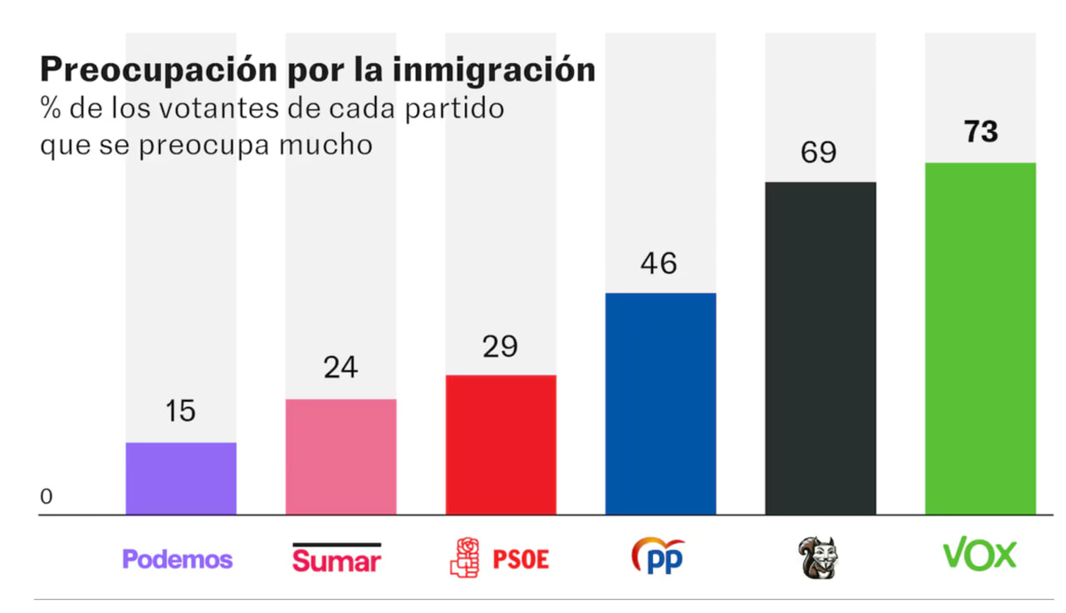 Согласно опросу, проведенному службой 40dB для газеты EL PAÍS, почти 60% испанцев считают, что в стране "слишком много иммигрантов". При этом более половины опрошенных переоценивают реальное количество мигрантов в Испании. Хотя иммиграция не является главной проблемой для испанцев (на первом месте стоимость жизни и жилья), она вызывает серьезное беспокойство у 41% населения. Фактически иммигранты составляют 13,5% населения, но в среднем респонденты полагают, что их более чем вдвое больше. 57,2% опрошенных считают, что иммигрантов "слишком много". Три четверти респондентов связывают иммиграцию с негативными явлениями, такими как преступность и безработица, несмотря на то, что большинство отмечает положительный личный опыт общения с иммигрантами. Отношение к иммиграции различается в зависимости от пола и возраста. Молодые люди 18-27 лет и мужчины в целом настроены более критично. 54% мужчин поколения Z считают, что иммигранты получают слишком много государственной помощи, по сравнению с