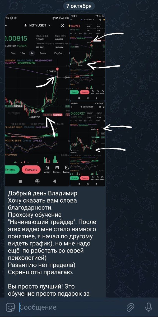 Это 6 разных человек пишут слова благодарности мне в личку, а я уже делюсь с вами по одной лишь причине: развеять возможные сомнения. Ведь только для этого люди читают отзывы, верно? Здесь есть мнения тех, кто просто смотрит мои бесплатные обзоры на TradingView, кто торгует по сигналам от индикатора VilarsoPro и подписан на закрытую аналитику топ 10 монет. Есть и те, кто недавно прошел у меня обучение. #Отзыв Больше информации о моих услугах - читайте в посте ниже ⬇️