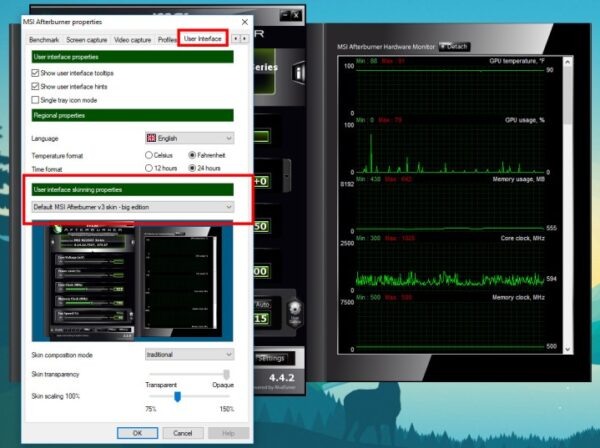 Чтобы узнать эти данные, закройте все работающие приложения и запустите MSI Afterburner. Хотя вы можете настроить внешний вид Afterburner по своему усмотрению, чтобы убедиться, что мы все на одной волне относительно расположения различных элементов, найдите кнопку «Настройки» и нажмите на нее. Воспользуйтесь стрелками навигации на верхней вкладке и выберите «Пользовательский интерфейс». Затем в разделе «Свойства скинов пользовательского интерфейса» с помощью выпадающего списка выберите «Скин MSI Afterburner v3 по умолчанию» и нажмите «ОК».