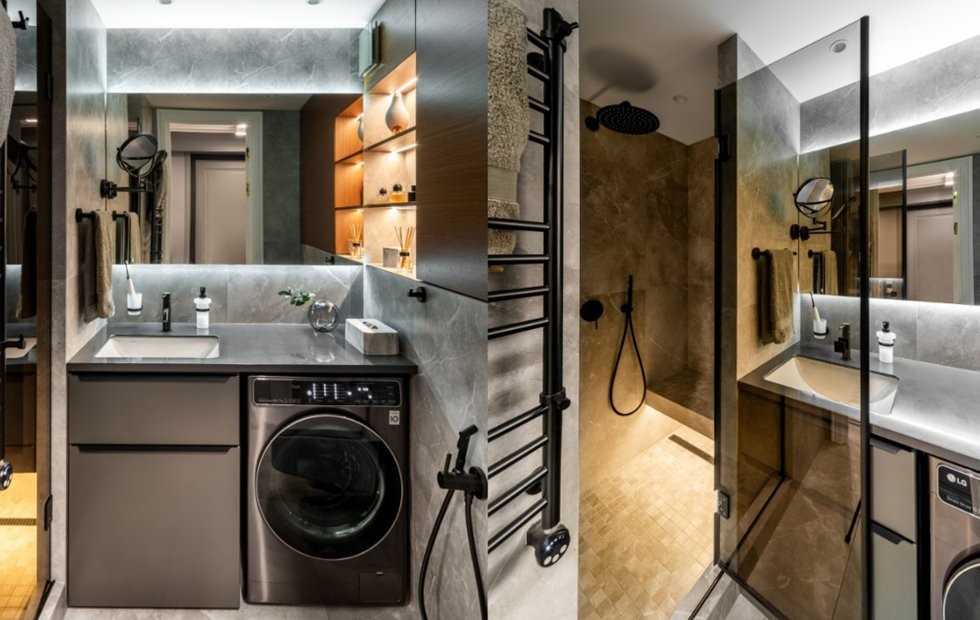 Несмотря на компактные размеры, санузел получился не только красивым, но и максимально функциональным. Здесь нашлось место для всего необходимого: просторной душевой кабины, умывальника с тумбой, унитаза, стиральной машины и системы хранения. При этом помещение не выглядит перегруженным, а наоборот, создает ощущение простора и легкости.