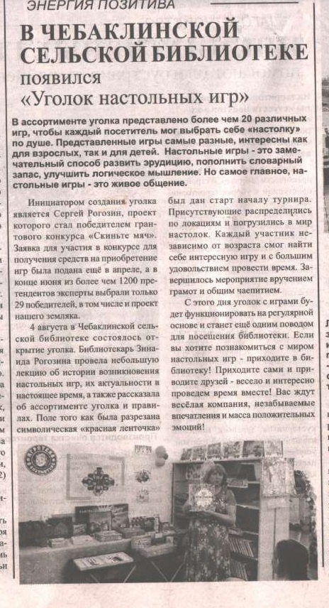 На базе Чебаклинской сельской библиотеки создан уголок, в ассортименте которого представлены следующие игры: