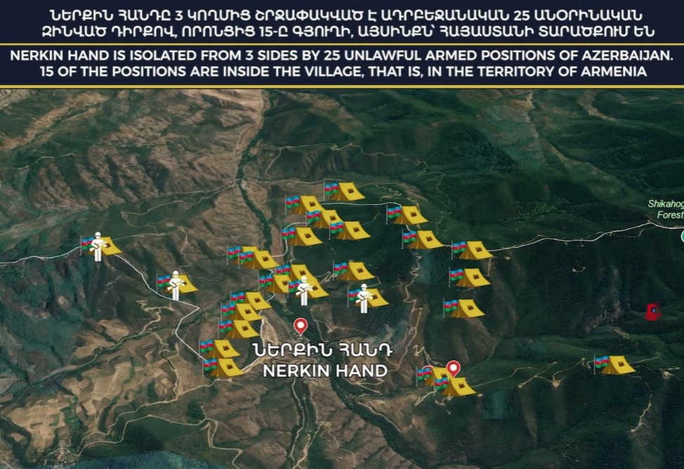 Неркин Ханд – село общины Капан Армении, которое с трех сторон окружено свыше двух десятков азербайджанских боевых позиций, только на этом участке оккупировано 2700 гектаров территории страны. Об этом говорится в заявлении, распространенном Фондом «Татоян». В нем, в частности, отмечается: «Мы доказательствами зафиксировали дополнительные факты азербайджанских преступлений в отношении жителей Неркин Ханда – тысячи вырубленных деревьев в государственном заповеднике «Шикаох» и строящиеся военные дороги в десятки километров, многочисленные размещенные мины, лишение жителей доступа к питьевой воде, наличие вооруженных позиций в непосредственной близости от гражданских домов и другие. Азербайджан проводит касающийся окружающей среды саммит COP29, в то время как сам разрушает окружающую среду Армении. Эти факты необходимо максимально широко представить на мировых платформах и показать реальные намерения Баку». Источник: https://news.am/rus/news/846469.html