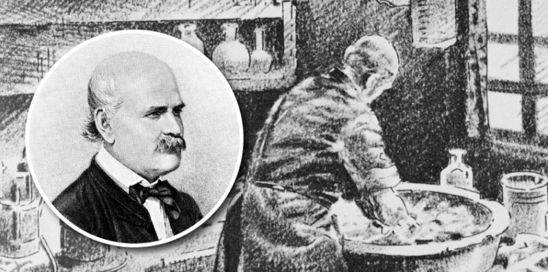 Земмельвейс — это тот самый человек, который открыл инфекции. Он не видел их в микроскоп, но видел смертность среди пациентов акушеров и хирургов, и искал причину. Как вариант, подумал он, дело может быть в немытых руках. Вот, он предположил существование инфекции — невидимой причины смертности.