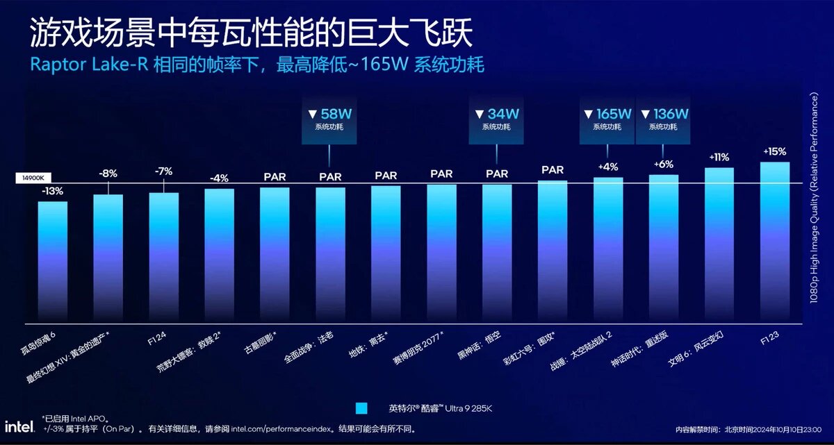 Грядущие процессоры Intel Core Ultra 9 должны стать новыми флагманскими решениями компании, но сами "синие" заранее знают, что у них не получится превзойти свой предыдущий флагман i9-14900K в играх. Об этом, собственно, свидетельствуют утекшие в сеть слайды с грядущей презентации компании. Но есть и значительные плюсы — новенький Core Ultra 9 285K будет потреблять в играх значительно меньше энергии, чем необходимо i9-14900K. В сравнении указано, что система с i9-14900K для достижения результатов выше потребляла в среднем на 80 Вт энергии больше. А еще нам говорят, что в рабочих задачах новинка все-таки опередит своего предшественника, причем на величины до 30%. Судя по всему, процессоры Ryzen 7800X3D продолжат быть игровыми королями с наивысшей энергоэффективностью на рынке минимум до релиза Ryzen 9800X3D, который, как говорят инсайдеры, может состояться до конца текущего года.