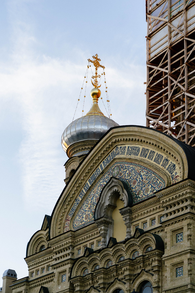 С Благовещенского моста хорошо виден главный купол храма Успения Пресвятой Богородицы на набережной лейтенанта Шмидта, украшенный позолоченной резьбой, которая эффектно смотрится на листах алюминия, создавая благородное сочетание золота с серебром. А если подойти поближе, то вас ожидает настоящее пиршество для глаз, настолько разнообразно украшены его фасады. Нижняя часть храма облицована серым гранитом, выше – отделана радомским песчаником и 14 видами особого кирпича, изразцами и мозаикой. Пятиглавый храм в неорусском стиле, который мы видим сегодня, построен по проекту знаменитого строителя соборов Василия Антоновича Косякова. Заложили его в 1891 году, освятили в 1897-м, а отделочные работы завершили только в 1903 году. Тогда на углу 15-й линии Васильевского острова и набережной Невы располагалось подворье Киево-Печорской лавры, а сейчас храм и прилегающие строения принадлежат Свято-Введенскому монастырю Оптиной пустыни. Специальный отделочный кирпич везли из Прибалтики с кирпичного