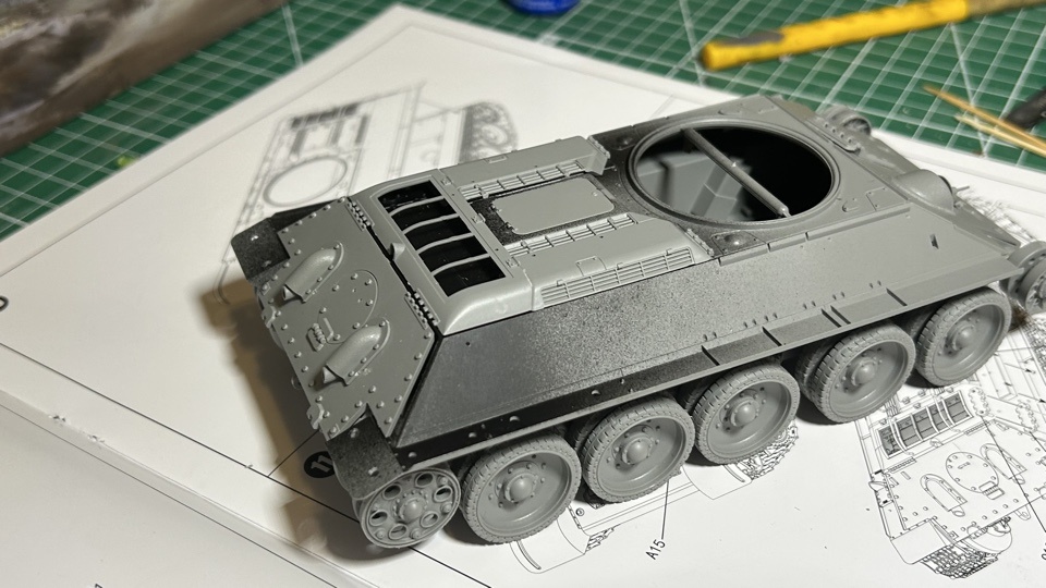 Здравствуйте мои дорогие любители волшебного пластика. Мы продолжаем неспешную сборку модели от Borderа. Как только выпадает минуточка, я тут же бегу к своему стапелю, где обитает эта чудесная во всех отношениях моделька. Итак, закончив с трудоемкой ходовой, я так сказать вырвался на оперативный простор. Об этом можно прочитать - вот тут: Но, прежде чем рассказать о дальнейших моих приключениях с "сормовичкой", я позволю себе немного повосхищаться крупными планами отливок и отдать дань тому, как тщательно Бордеры подошли к воссозданию фактуры материалов. С моей точки зрения это прямо искусство. Восхитились? Пришла возвращаться от романтики к суровым моделистическим будням. Без шпаклевки не обошлось. Две лишних дырочки под замазку. Но это не порок модели, а моя небрежность. Я слишком сильно срезал пины у стопора амортизатора, и снаружи остались ямки. Но братия... разве нас этим напугаешь? Какая сборка обходится без шпакли. Не будем останавливаться на этом слишком уж долго. Погнали д
