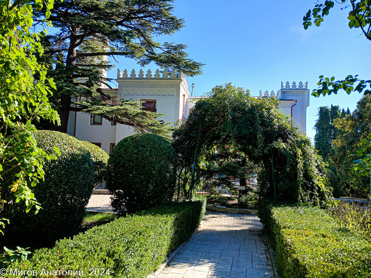 Сегодня у нас с Леной процедуры были с утра, так что мы успели до обеда погулять по парку санатория. Парку, между прочим, уже 125 лет, он большой, с огромными старыми деревьями, за 4 дня мы пока не сумели весь его обойти. А еще мы взяли несколько мини-интервью у людей, которые уже завершают свой отдых в санатории "Узбекистан". Интересно же узнать, как другие оценивают время, проведенное здесь, и сравнить со своими впечатлениями. Но об этом чуть позже, а пока я хочу показать вам несколько парковых пейзажей, снятых мною во время прогулки. Позавчера в Ялте слегка дождило. А когда вышло солнце, всё вокруг было чётким и чистым. Особенно прекрасно смотрелись горы, закрывающие ЮБК от северных ветров. Дождик на самом деле был слабым, а солнце жарило не на шутку и, наверное, поэтому в парке включили поливальную систему. В сочетании с сочной зеленью и цветами это очень красиво. Мы с Леной обследовали удаленную часть парка. Здесь не так роскошно, как в парадной зоне санатория, но есть своя прел