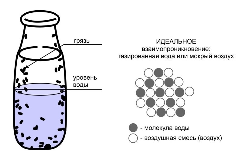 Процесс отмывания происходит при встряхивании бутылки, которое приводит к перемешиванию воды и воздуха, к взаимному проникновению их друг в друга. Вода разделяется воздухом на капли (капля есть некое количество воды, окруженное воздухом), а воздух разделяется водой на порции – воздушные пузыри. В этой смеси нельзя определить главный компонент; о смеси можно сказать, что она представляет собой и воздушную воду (газировку), и мокрый воздух. Чем интенсивнее встряхивание, тем больше проникают друг в друга вода и воздух, тем на более мелкие фрагменты они разделяют друг друга, тем лучше и быстрее идет отмывание бутылки. Если каждая отдельная капля воды соприкасается с частицей грязи и смывает ее, то значит, ни одна капля воды не бездействует, т.е. вода эффективно используется. Этого и добиваются в различных моечных устройствах.