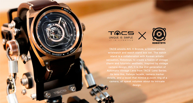 Японская компания TACS анонсировала лимитированную серию часов, которые будут выпущены в количестве всего 500 штук. Примечательно то, что часы идут в комплекте с подставкой в виде забавного робота гуманоида. Модель называется AVL II Bronze. Это уже второе поколение подобных часов с выпуклым сапфировым стеклом и формой безеля, который напоминает объектив ретро фотокамеры.