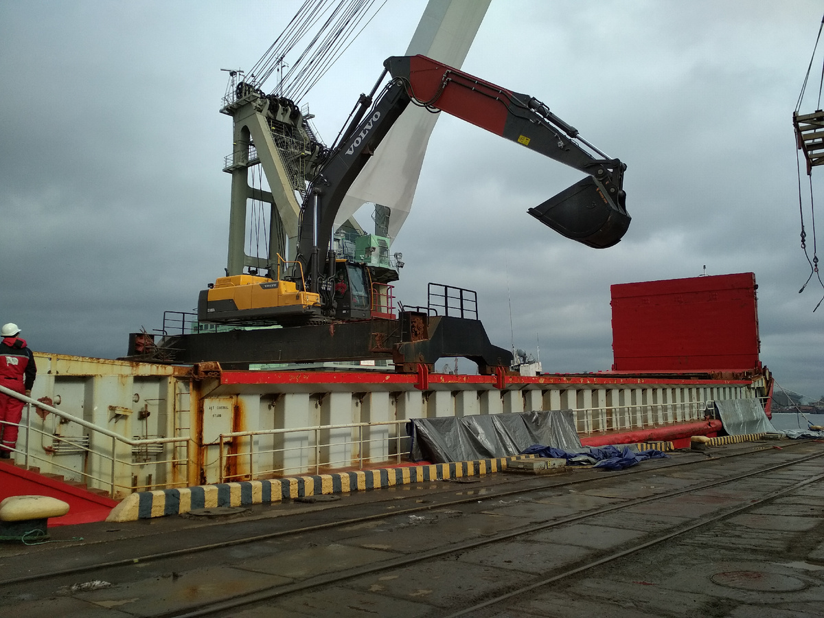 Сухогруз FEED HALTEN, сейчас RIX EIRA под флагом Латвии, и экскаватор при нем...