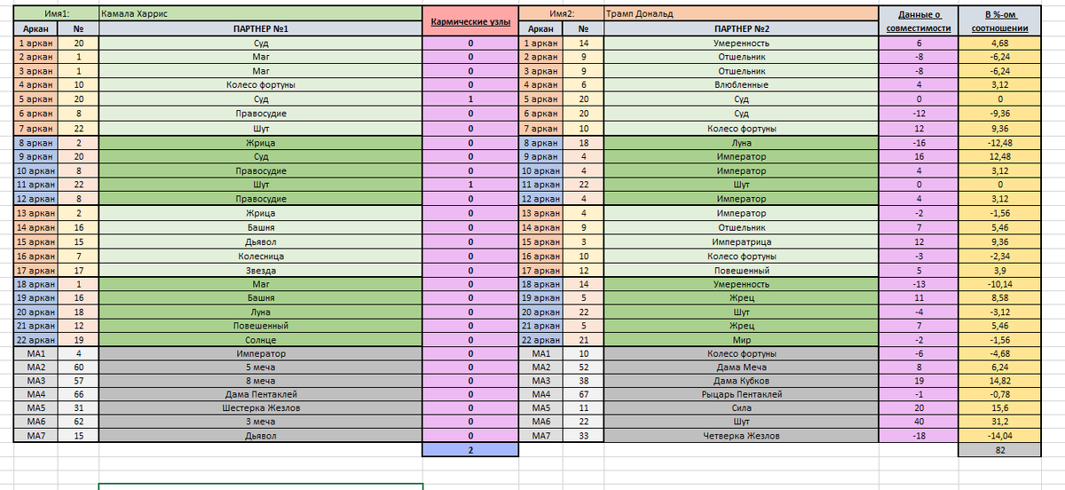 По поводу американских выборов - полагаю все же их президентом станет Трамп. Второй раз. По крайней мере его таблица содержит в себе арканы Император, причем дублированные. Впринципе оба кандидата - по нумерологии - балаболы те еще. Но от Харрис вреда куда больше может быть. У Трампа нету башен.