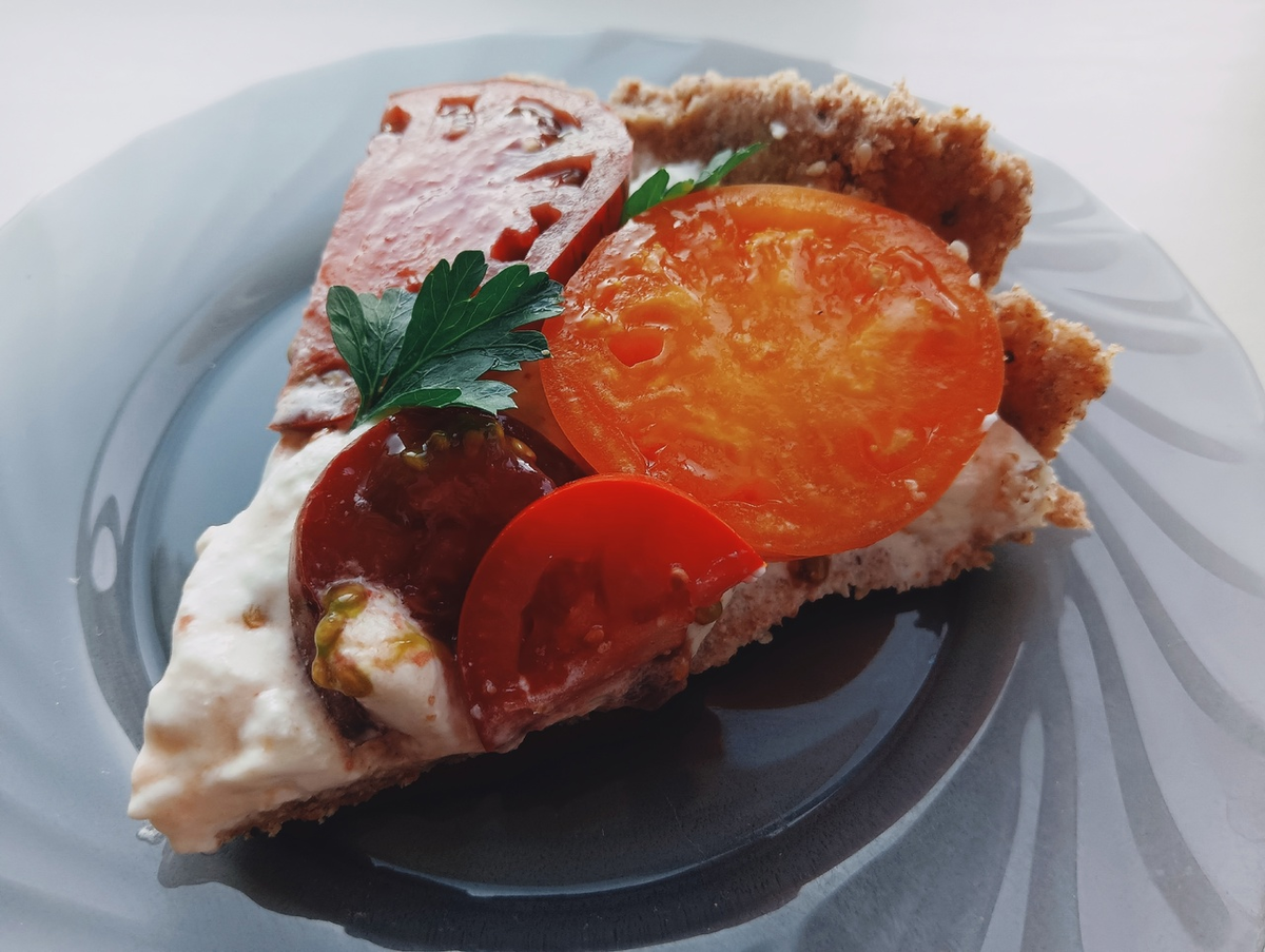 Ингредиенты: 1. Муку высыпаем в миску и добавляем щепотку соли. 2. Нарезаем масло (из холодильника) небольшими кусочками и добавляем к муке. 3. Руками перемешиваем муку с маслом. 4. Добавляем сушеный базилик. 5. Далее добавляем кунжутные семечки. 6. Чтобы тесто лучше скрепилось, добавим 2 ст. л. обычной воды и замешиваем. Делаем из теста такой шарик (как на фото), кладём его в пакет и убираем в холодильник на 15 мин. 7. Раскатывает тесто между двух пластов пергамента, чуть больше чем форма для запекания. Заранее приготовьте круглую форму для запекания. У меня она диаметром 28 см. 8. Перекладываем тесто в форму. 9. Чтобы тесто удержало свою форму и не поднялось, я положила сверху пергамент и насыпала фасоль. Ставим корж выпекаться в духовку на 15 мин при 180 С. Через 15 мин убираем пергамент с фасолью и еще допекаем 5 мин. 10. Пока корж остывает сделаем сливочный крем. Для этого нужно взбить сливки, чтобы они стали плотными и увеличились в объеме. 11. К сливкам добавляем творожный сыр